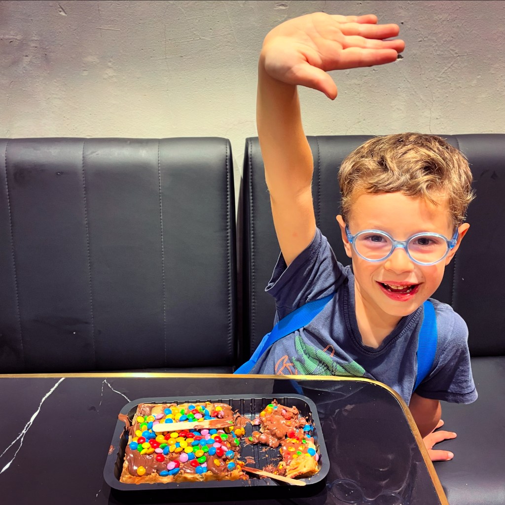 Ci fermiamo poco prima della Grand Place per una tappa gastronomica, assaggiamo i gaufres alla maniera di Bruxelles. Scelgono Frenci e Richi e ovviamente sono pieni di nutella e dolciumi. Sono abbondantemente sufficienti anche come pranzo.